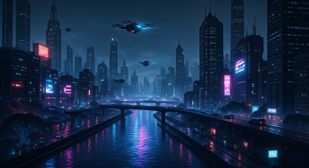 O lendário rio renasce com águas refletindo néons e drones pairando sobre suas margens. Em vez de poluição, o brilho artificial domina o cenário — um lembrete de como até a natureza pode ser reprogramada.