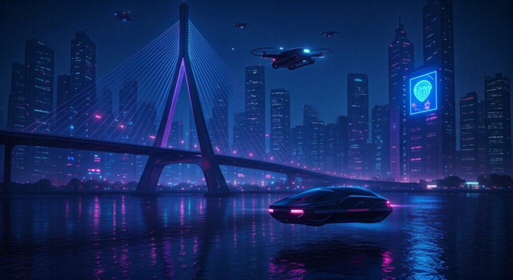 A Ponte Estaiada se ergue como um colosso de metal e energia. Seus cabos se iluminam com circuitos de luz azul e roxa, refletindo no rio abaixo — um símbolo de conexão em um mundo dominado por redes e dados.