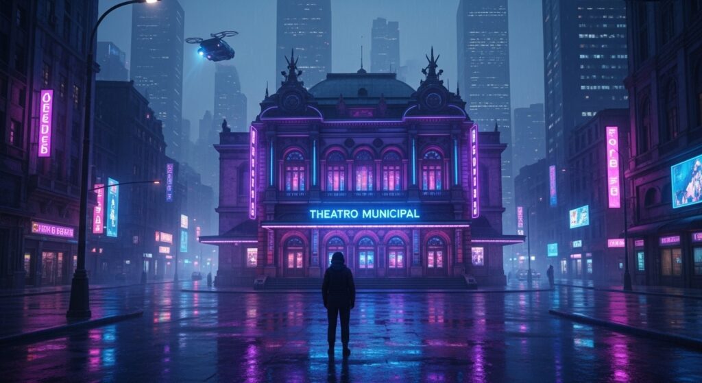O clássico teatro é reimaginado como um centro de espetáculos holográficos, onde arte e tecnologia se fundem. Sua fachada histórica se mistura a letreiros digitais e painéis de luz pulsante, evocando uma elegância decadente.