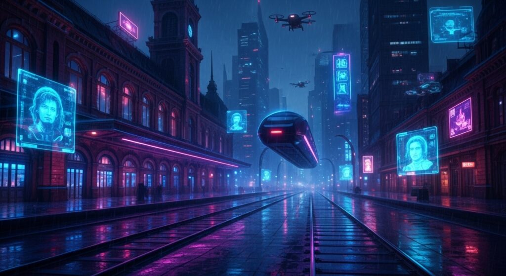 Símbolo do passado ferroviário de São Paulo, a Estação da Luz se transforma em um terminal interplanetário. Trilhos magnéticos e trens suspensos cruzam o céu noturno — uma homenagem ao movimento e ao tempo.
