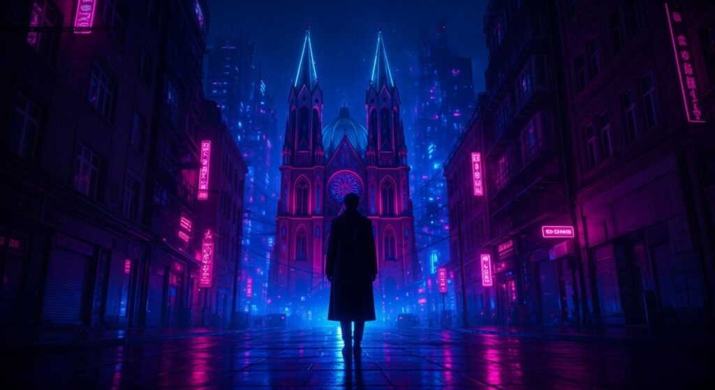 O coração espiritual da cidade ganha um novo rosto. A imponente Catedral surge envolta em néons e drones, contrastando sua arquitetura gótica com o brilho frio de um futuro mecanizado. Um ponto de fé no meio do caos urbano.